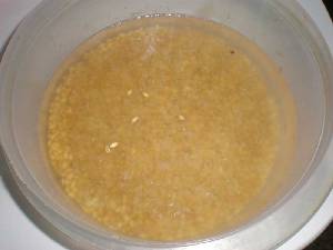 El día antes de cocinar el guiso tendremos que poner a remojo los garbanzos, las alubias y el trigo. Podemos poner los garbanzos y las alubias juntas y el trigo a parte.